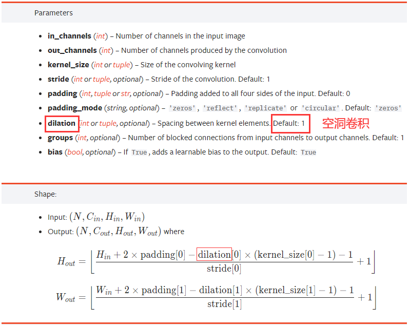 这部分代码完全是根据上图中的模型一步步写的,具有一一对应的关系,只是在卷积中的padding需要我们根据前后输入输出的尺寸进行计算,最后发现三步卷积padding都为2,这里给出pytorch官网的相关计算公式: