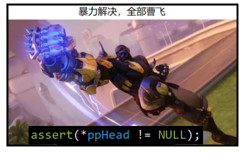 🔑 解读:销毁得有东西才能销毁,所以断言 ppHead 不为空。通过 cur 逐个走一遍,为了防止删了一个下一个结点就找不到了,每次进入循环都先创建一个 next 指针来保存 cur->next,然后再 free 掉。全部结束后再把 *ppHead 置为空,就完成销毁了。