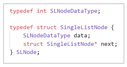 🔑 解读:在顺序表章节讲过,为了方便后续使用我们将类型 typedef 一下。首先创建结构体,因为叫单链表,所以我们将它取为 SingleListNode。结构体有两个变量,data 是用来存放节点的数据的变量,而 next 是用来指向后继节点指针的变量。我们详细来说说结构体指针 next,它的类型是 struct SingleListNode* 也就是自己本身,从而实现 "套娃" 的效果,这么一来它就拥有了 "链接" 的资本(既可以存数据,又可以存下一个节点的地址,简直是一直用一直爽啊)。为了方便后续地使用,我们再把这个结构体重命名成 SLNode(非常合理的简写,SingleListNode)。