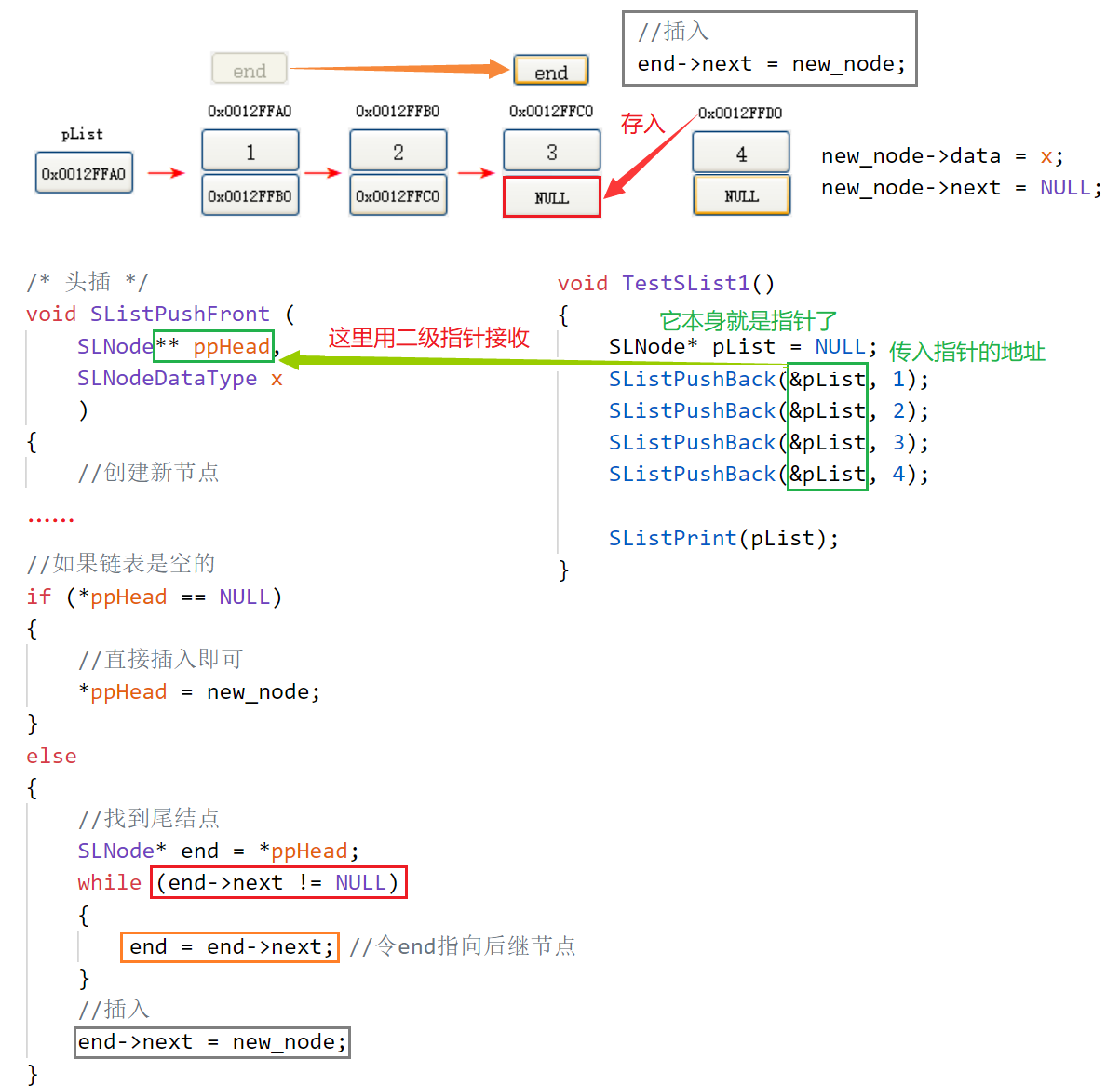🔑 解读:创建一个新节点,我们就需要动态开辟内存,所以我们要引入 #include <stdlib.h> 这个头文件。SListPushBack 函数参数为 SLNode** pHead,这里用 "二级指针" 接收,因为传入的就是一个结构体指针的地址(&pList),它本身就是一个指针了,所以这里我们就需要用指针的指针(即二级指针)来接收它。因为形参是实参的一份临时拷贝。至于这里为什么传入 &pList 呢?因为形参只是实参的一份临时拷贝,为了能够改变外部,所以我们要采用址传递(即传入结构体指针 pList 的地址并用二级指针接收)。