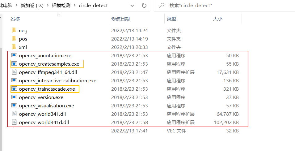 需要注意的是,生成.vec需要opencv_createsamples.exe,这个文件我在环境准备时已经给出,其放置位置如下:【黄框框住的才是我们真正需要的,其他有的是这俩所依赖的,有的可能不是,所幸我把opencv里面的文件都放进来了,这样多了文件也不会错】