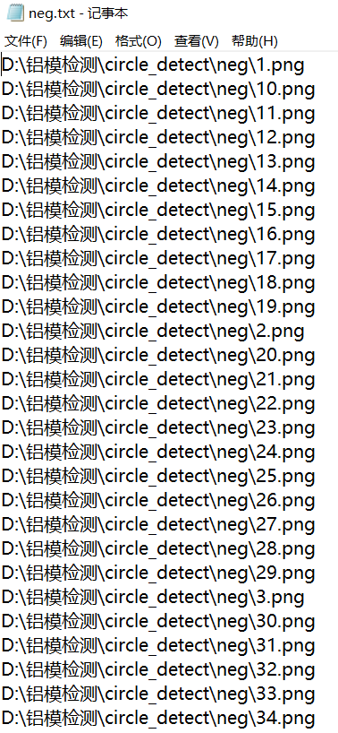 同样的方法,现在我们先进入neg文件夹,然后在cmd中输入dir /b/s/p/w *.png > neg.txt,这时候会在neg文件夹中生成一个neg.txt文件,这时产生的文件不做任何修改。最终neg.txt文件中的内容应具有如下的格式。【注意:这里的路径确保是绝对路径,否则后面训练时可能会出错】
