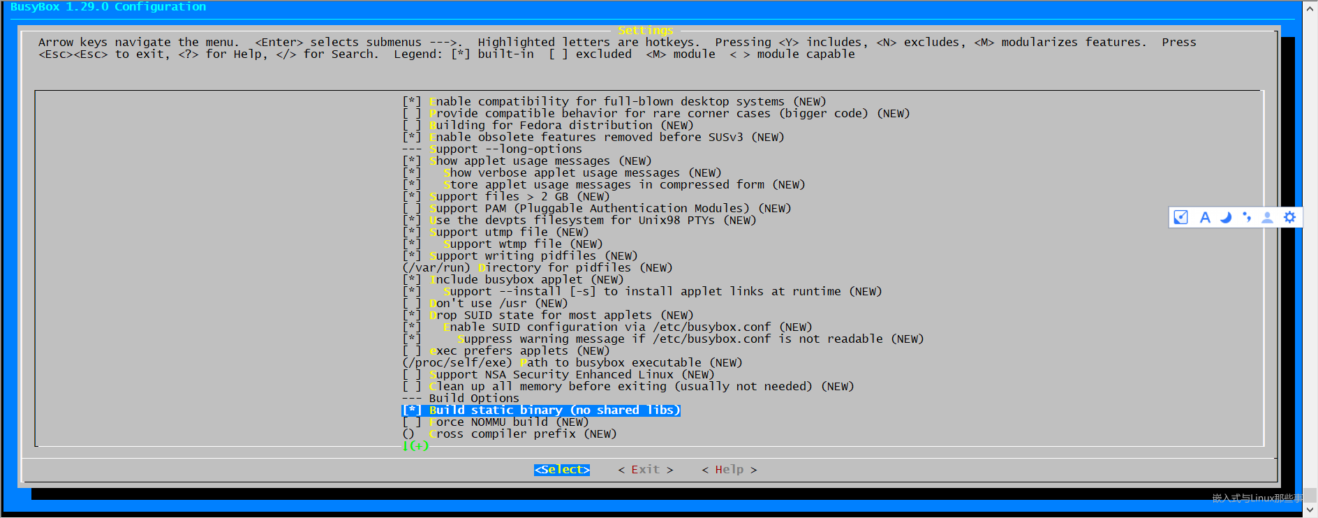 这里一定要选择静态编译,编译好的可执行文件busybox不依赖动态链接库,可以独立运行,方便构建initramfs。