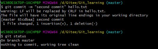 接下来继续使用git status来查看状态,发现和一开始没有文件时的结果一样显示没有文件需要提交,因为我们的文件已经通过commit命令提交到了本地库。