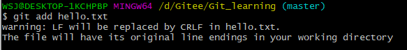 git add 文件名将工作区文件添加到暂存区将之前的hello.txt添加到暂存区。【warning警告可以不管】