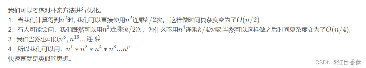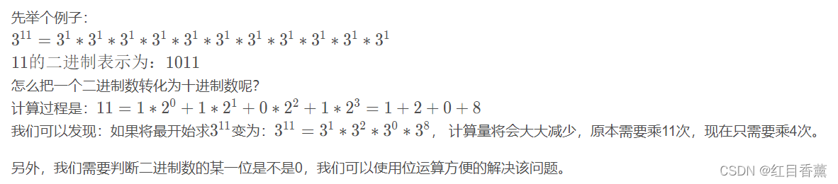 当我们计算时,常用的做法是对n连乘k次, 但如果k特别大,假如k = 1e6, 如果仍然对n连乘1e6次的话,时间消耗就太大了。那么我们如何在短时间内求出一个数的k次方呢。