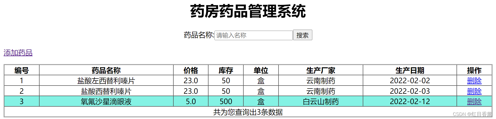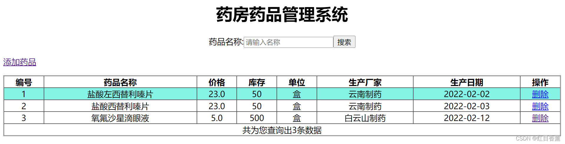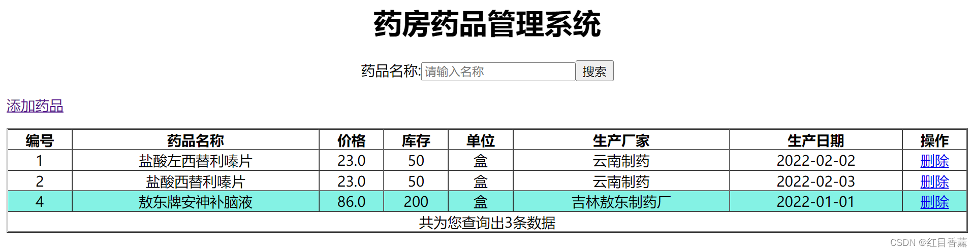 3. 药品管理人员输入药品名称,点击查询,则完成模糊查询,显示查询结果,如图 3 所示。