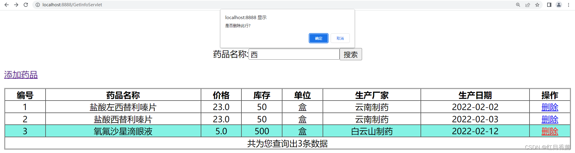 4. 用户点击删除,则弹出提示框,用户点击确定后,删除选中数据并显示最新数据,如图 4 和图 5 所示。