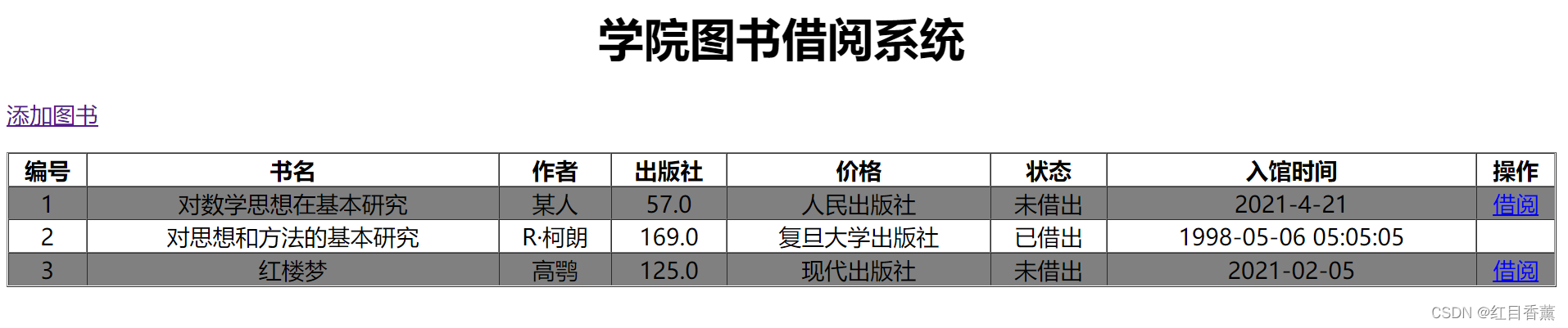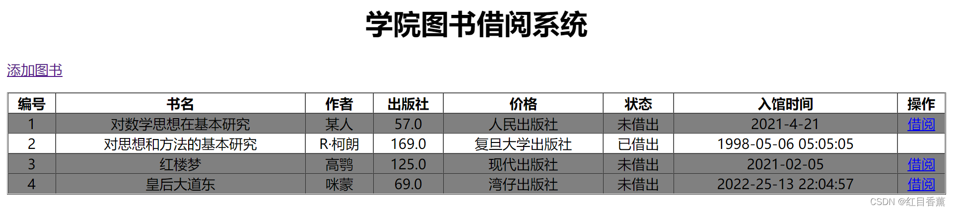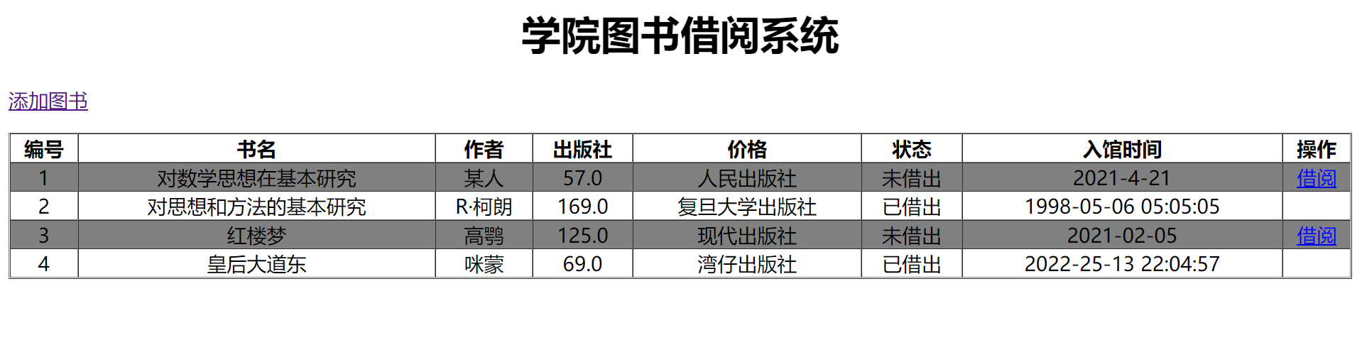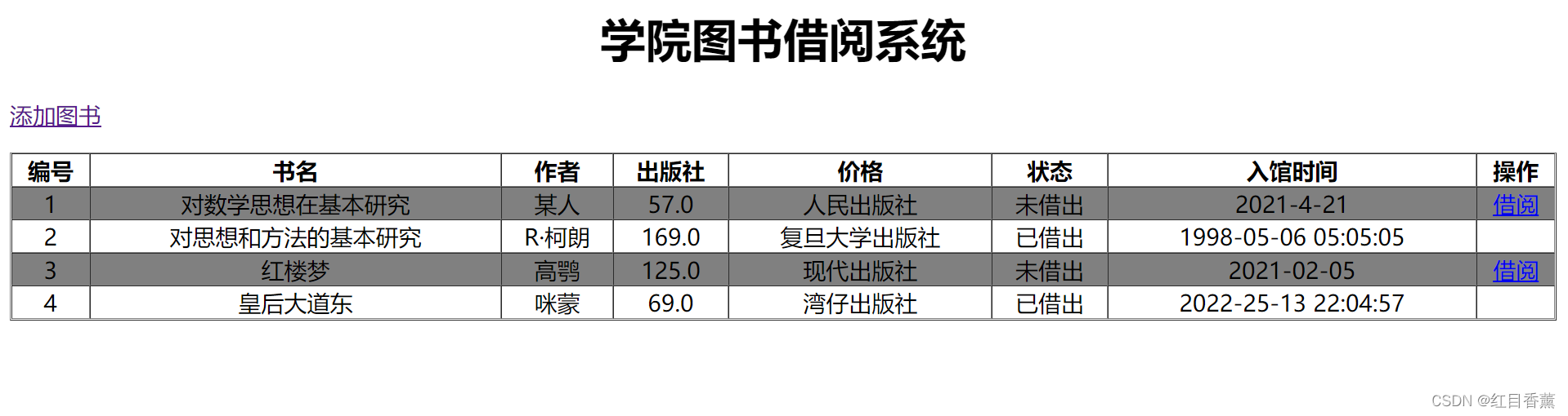 (2)如果该书籍已经被借出,则显示为灰色背景,同时最后无“借阅”操作链接,如果未被借出,则显