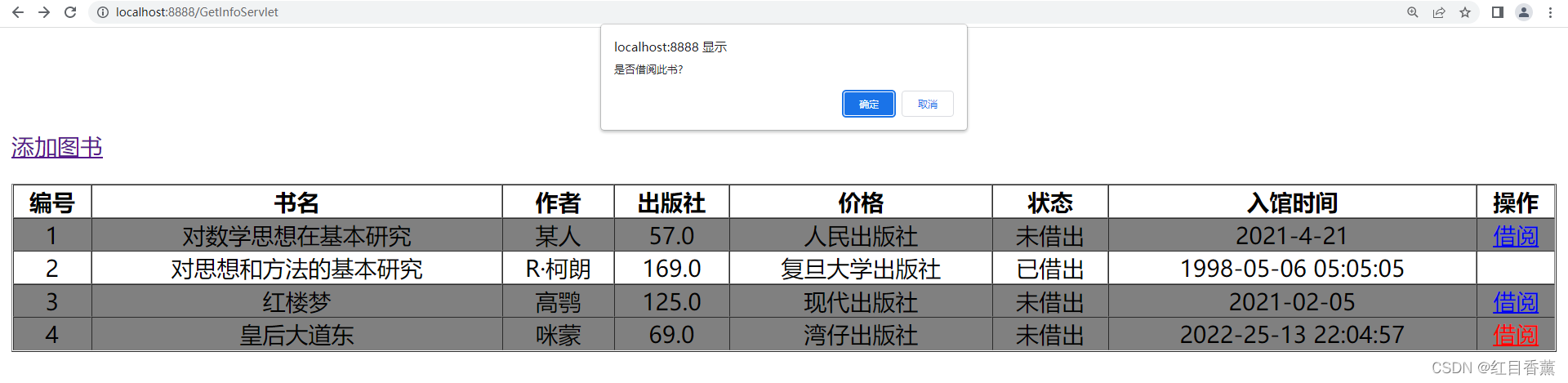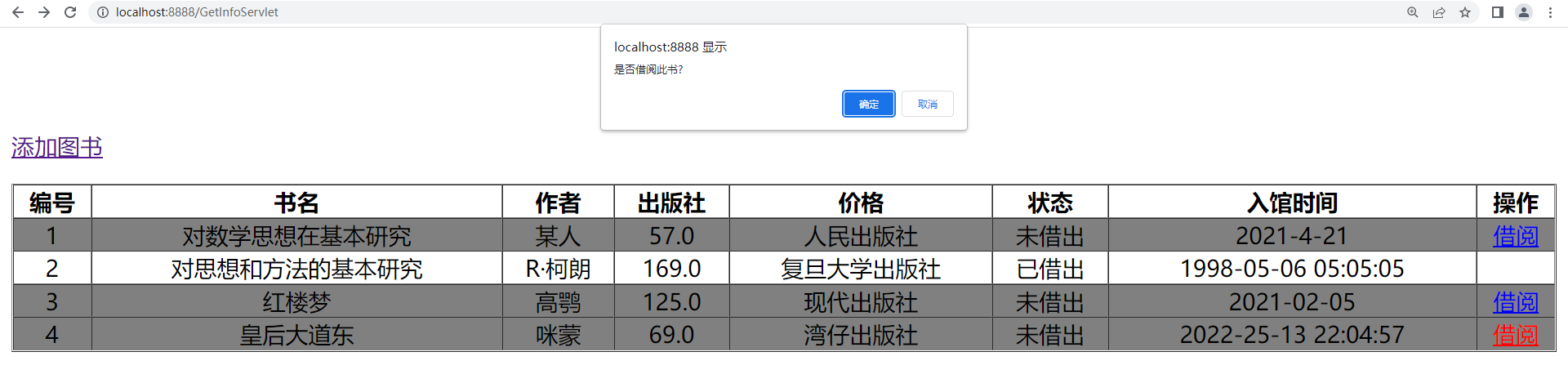 5. 用户点击图书列表界面中的“借阅”超链接,弹出提示“您确认借阅该图书?”,如图 5 所示,点击确定后执行借阅操作,然后列表将进行自动刷新,此时借阅的图书状态变更为“已借出”且带有灰色背景色,如图 6 所示。