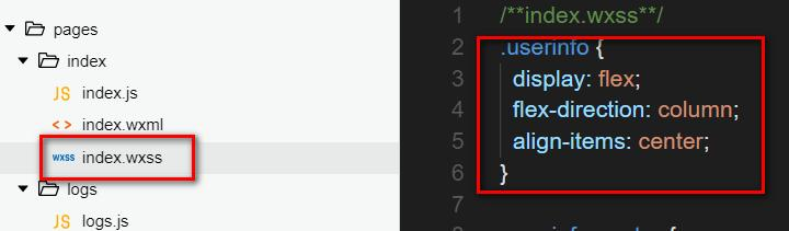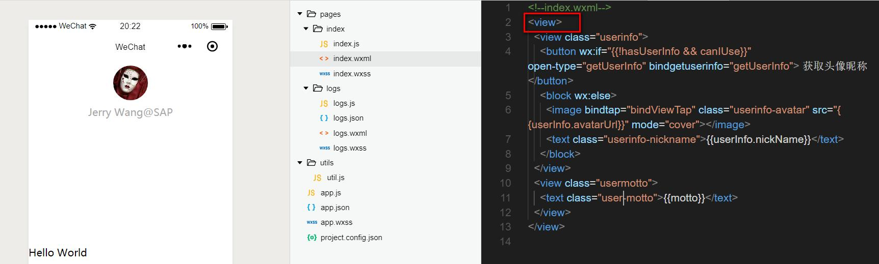 第三行: <view class="userinfo"> view元素可以嵌套,相当于原生HTML里的div元素。此处定义了另一个view元素,css类为userinfo。这个css类不是微信提供的,而是我们自己开发的,位于文件index.wxss里: