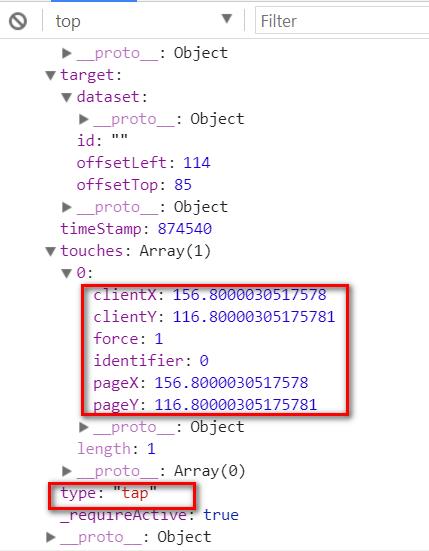 当事件处理函数被调用时,这个输入参数e是微信框架自动传入到事件处理函数的。通过微信开发者工具的调试器可以看到这个参数e的明细:tap事件发生的X和Y坐标,以及事件类型tap。