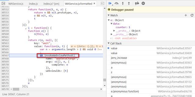 继续查看emit的实现,可以发现emit又调用了微信工具类wx的方法:invokeWebviewMethod。从WAService.js的内部实现,我们能发现其实微信小程序在手机上的执行实际是运行在WebView里的。