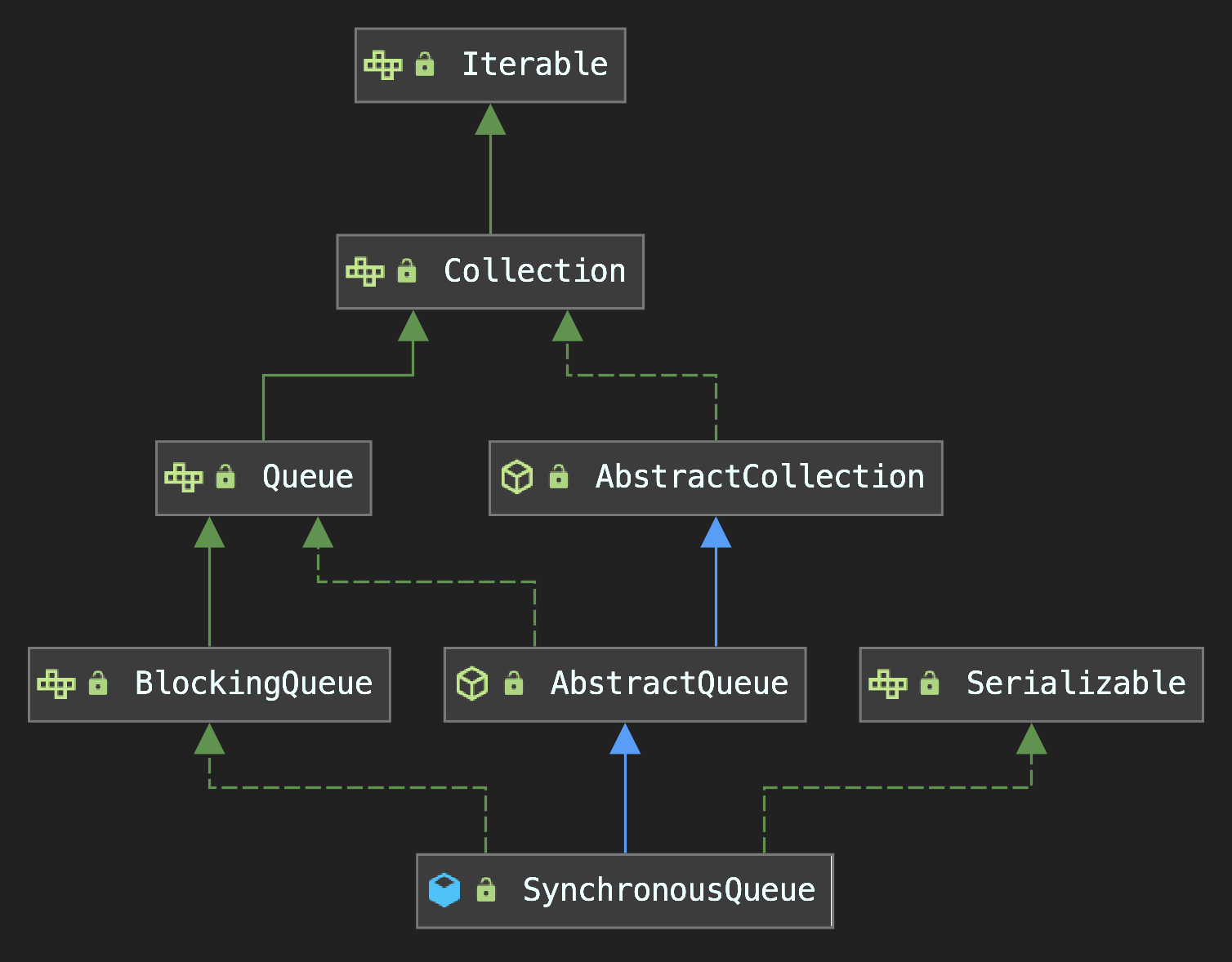 SynchronousQueue 整体类图和 LinkedBlockingQueue 相似,都实现了 BlockingQueue 接口,但因为其不储存数据结构,有一些方法是没有实现的,比如说 isEmpty、size、contains、remove 和迭代等方法,这些方法都是默认实现,如下截图: