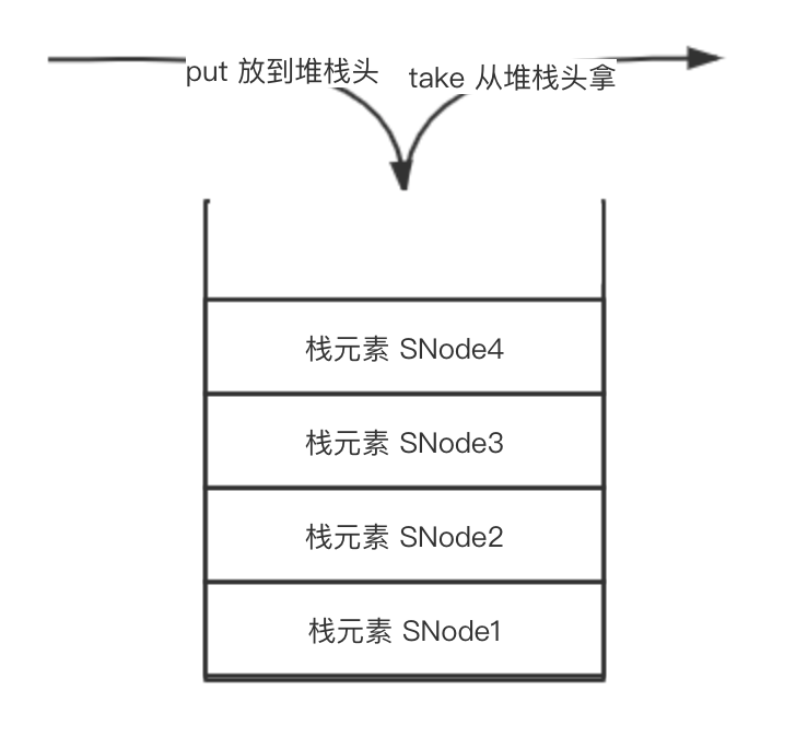从上图中我们可以看到,我们有一个大的堆栈池,池的开口叫做堆栈头,put 的时候,就往堆栈池中放数据。take 的时候,就从堆栈池中拿数据,两者操作都是在堆栈头上操作数据,从图中可以看到,越靠近堆栈头,数据越新,所以每次 take 的时候,都会拿到堆栈头的最新数据,这就是我们说的后入先出,也就是非公平的。