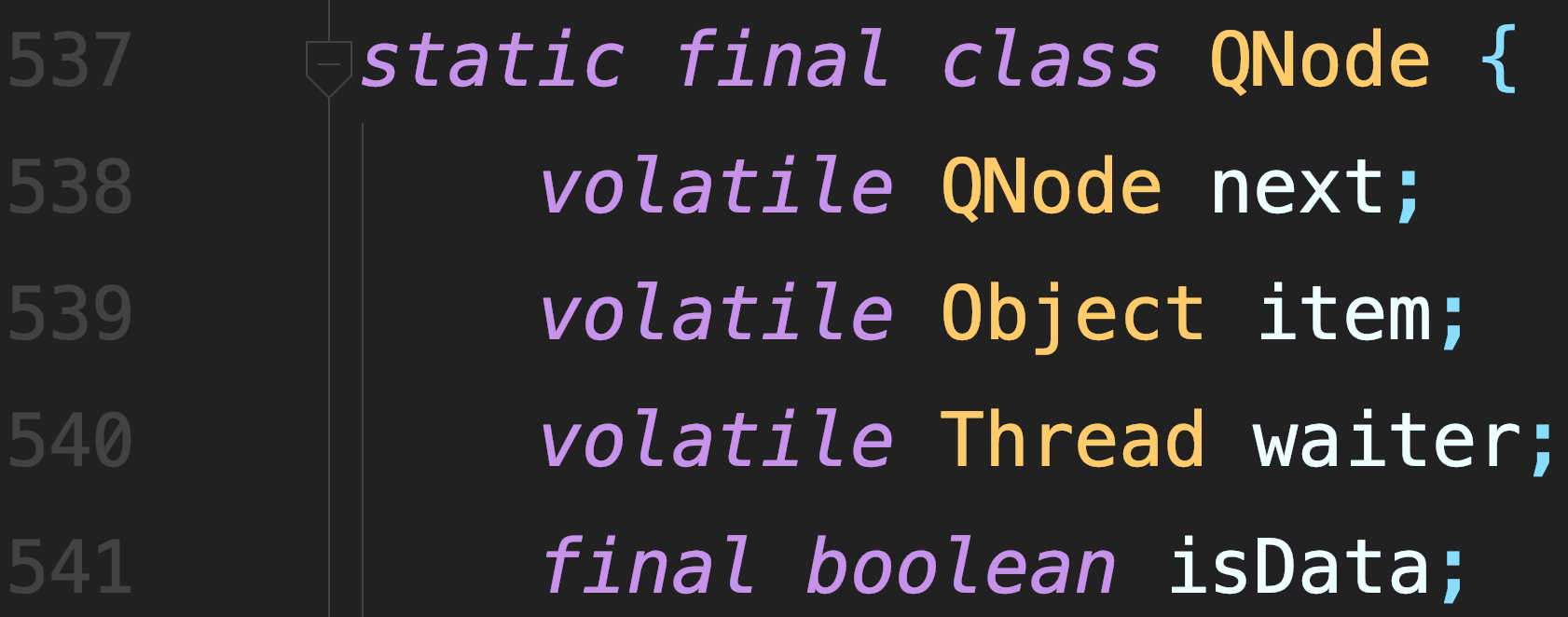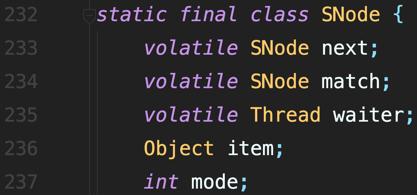 不像ArrayBlockingQueue、LinkedBlockingDeque之类的阻塞队列使用AQS实现并发,SynchronousQueue直接使用CAS操作实现数据的安全访问,因此源码中充斥着大量的CAS代码。