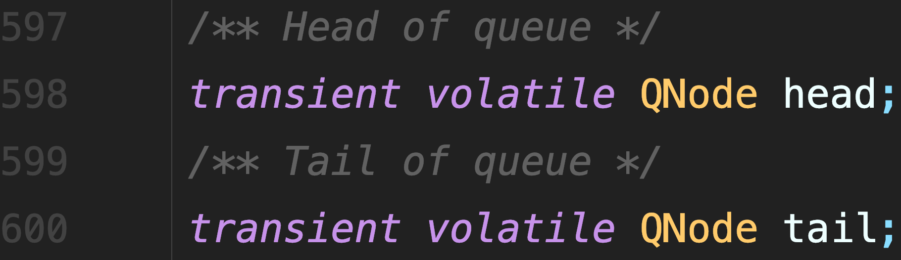 // 因为 tail 和 head 在 TransferQueue 初始化的时候,就已经被赋值空节点了
