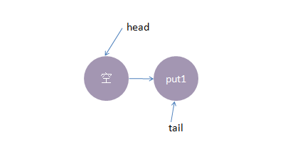 线程put1执行 put(1)操作,由于当前没有配对的消费线程,所以put1线程入队列,自旋一小会后睡眠等待,这时队列状态如下: