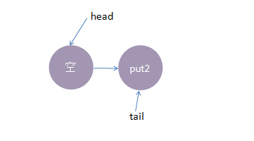 接着,线程put2执行了put(2)操作,跟前面一样,put2线程入队列,自旋一小会后睡眠等待,这时队列状态如下: