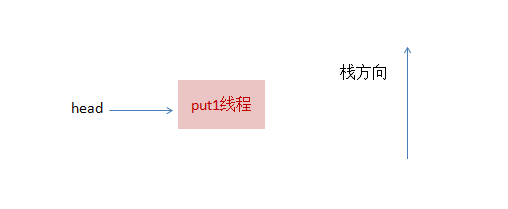 线程put1执行 put(1)操作,由于当前没有配对的消费线程,所以put1线程入栈,自旋一小会后睡眠等待,这时栈状态如下