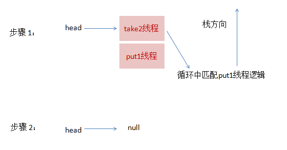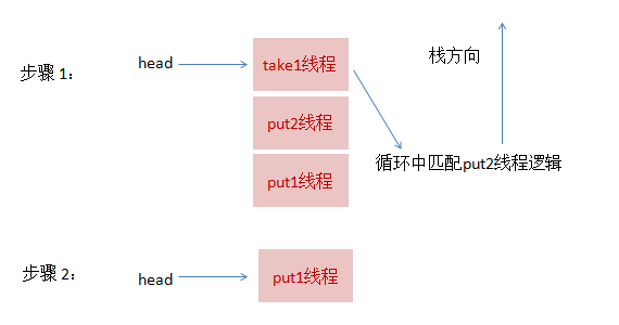 这时候,来了一个线程take1,执行了take操作,这时候发现栈顶为put2线程,匹配成功,但是实现会先把take1线程入栈,然后take1线程循环执行匹配put2线程逻辑,一旦发现没有并发冲突,就会把栈顶指针直接指向 put1线程