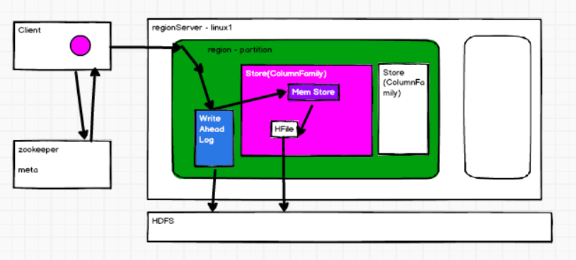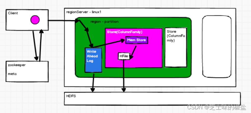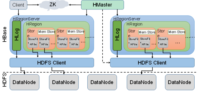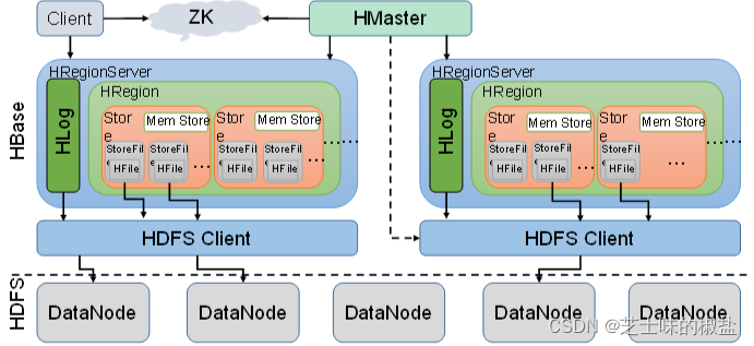 - 备注:RegionServer的作用是管理region、承接业务的访问,这个后面会详细的介绍通过横向添加Datanode的机器,进行存储层扩容,提升Hbase的数据存储能力和提升后端存储的读写能力。