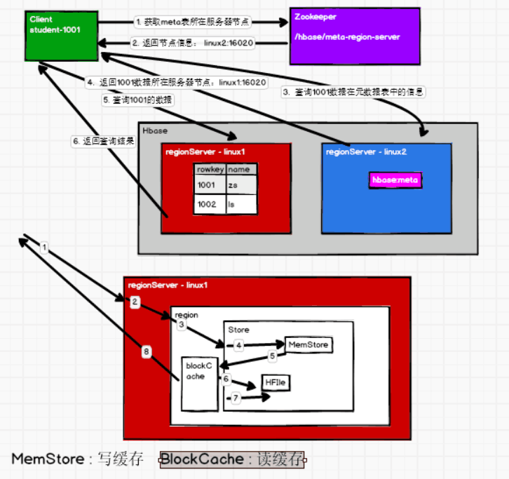 5)先从MemStore找数据,如果没有,再到BlockCache里面读;
