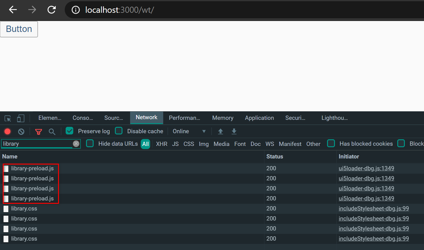 上图是按照Jerry文章一个用于SAP UI5学习的脚手架应用,没有任何后台API的依赖里介绍的方法,开发了一个只包含button控件的最简单的SAP UI5应用,加载之后在Chrome开发者工具里观察到的网络请求,其中包含四个library-preload.js的加载: