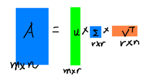 • 任何一个MxN的矩阵A,如果它的行数M大于或等于它的列数N,那么它就可以被转换成以下三个矩阵的乘积:一个MxR的正交矩阵U, 一个RxR的对角矩阵(奇异值矩阵), 和一个RxN正交矩阵V的转置矩阵