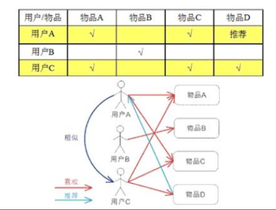 图给出了一个例子,对于用户A,根据用户的历史偏好,这里只计算得到一个邻居用户C,然后将用户C喜欢的物品D推荐给用户A。