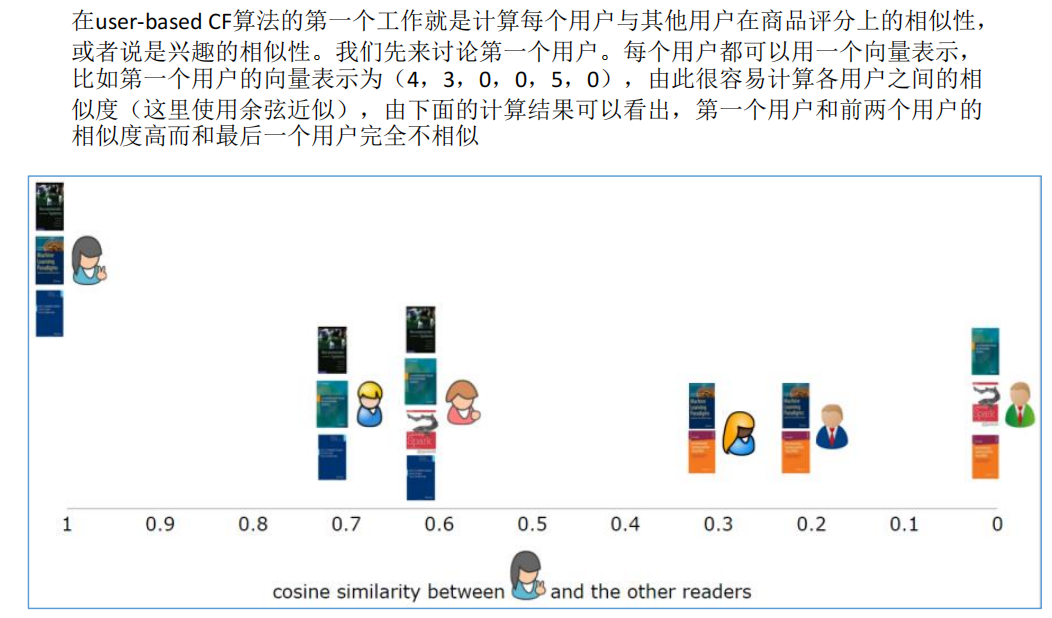 计算上,就是将一个用户对所有物品的偏好作为一个向量来计算用户之间的相似度,找到相似邻居后,根据邻居的相似度权重以及他们对物品的偏好,预测当前用户对没有涉及的物品的偏好,计算得到一个排序的物品列表作为推荐。