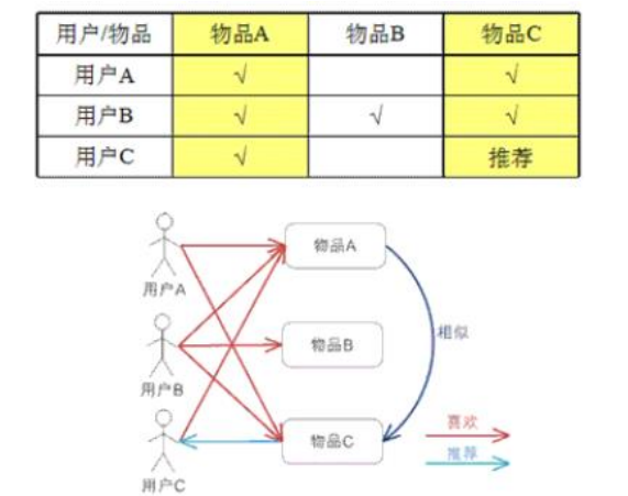 从计算的角度看,就是将所有用户对某个物品的偏好作为一个向量来计算物品之间的相似度,得到物品的相似物品后,根据用户历史的偏好预测当前用户还没有表示偏好的物品,计算得到一个排序的物品列表作为推荐