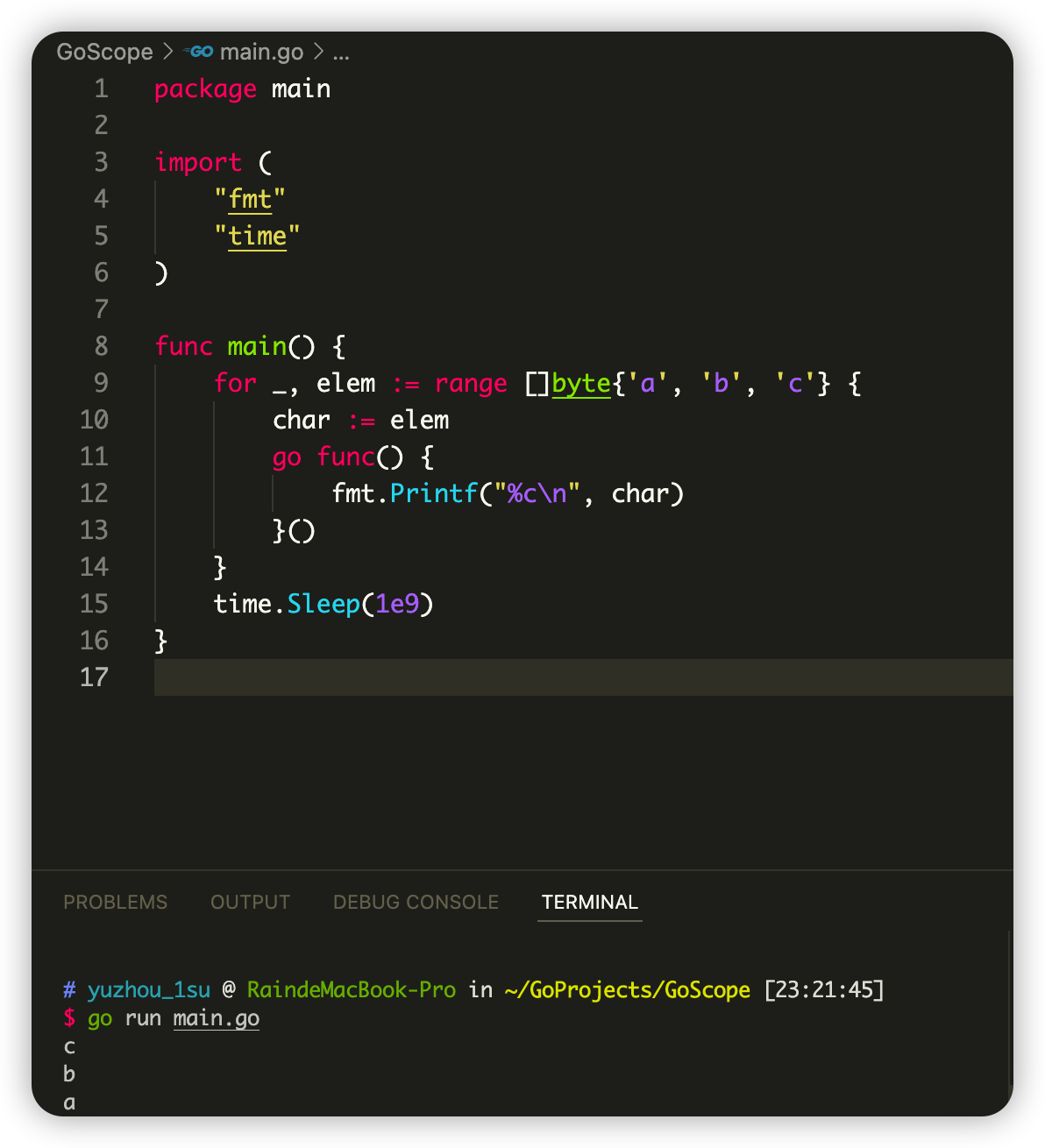当我们复制变量时,我们创建一个新变量并将 elem 的值分配给它。我们在每次迭代中都这样做,这意味着对于每个步骤,我们都会创建一个新变量,goroutine 会引用该变量。每个 goroutine 都有一个对不同变量的引用,并且它也可以正常工作。