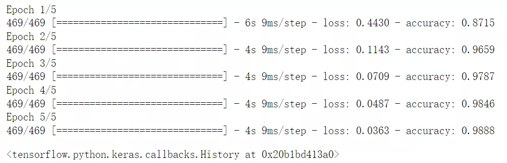 上述每次训练输出两个值:一个是网络在训练数据上的损失(loss),即当前输出与预期值的差距,另一个是网络在训练数据上的精度(acc)。