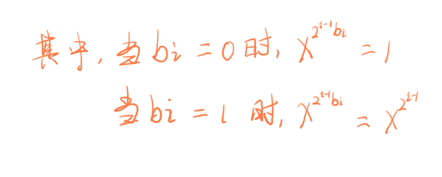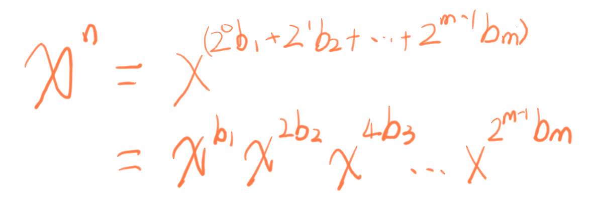 二进制角度解释: 假设需要求x的n次方,也就是x^n^,其中n为整数。对与任何十进制整数,它的二进制序列为b~m~b~m-1~…b~i~…b~2~b~1~,其中0 < i <= m。