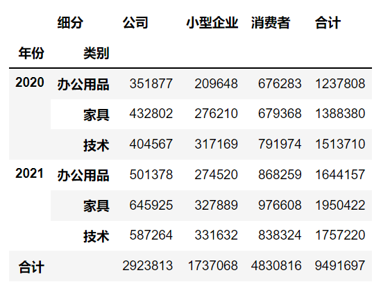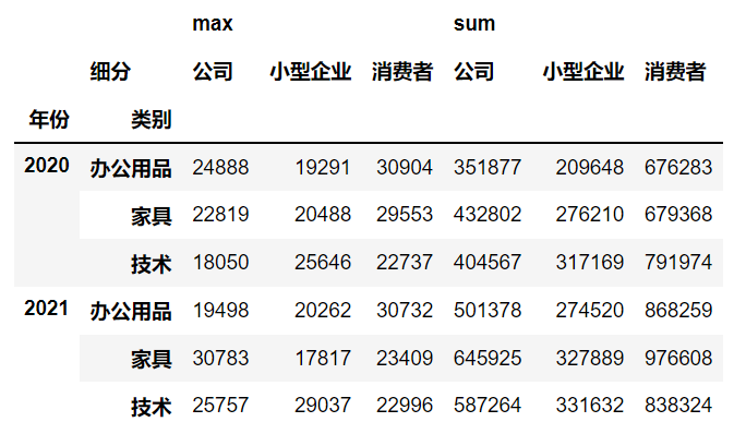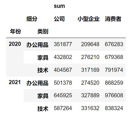现在按年份来统计销售数据,注意此时的aggfunc参数,当参数值包含列表时,在结果DataFrame中就会显示函数名称。