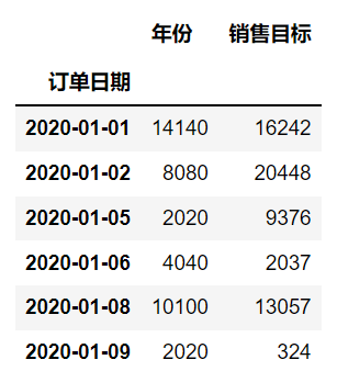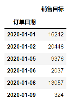 df.head(20).groupby(['订单日期'])['销售目标'].sum().reset_index()