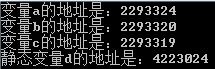首先栈的顶部为地址的“最小”索引,随后往下依次增大,但是由于堆栈的特殊存储结构,我们将变量 a 先进行存储,那么它的一个索引地址将会是最大的,随后依次减少;第二次存储的值是 b,该值的地址索引比 a 小,由于 int 的数据大小为 4,所以在 a 地址为 2293324 的基础上往上减少 4 为 2293320,在存储 c 的时候为 char,大小为 1,则地址为 2293319。由于 a、b、c 三个变量同属于一个栈内,所以它们地址的索引是连续性的,那如果我创建一个静态变量将会如何?在以上内容中说明了静态变量存储在静态区内,我们现在就来证实一下: