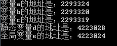 以上代码中创建了一个变量 d,变量 d 为静态变量,运行代码后从结果上得知,静态变量 d 的地址与一般变量 a、b、c 的地址并不存在连续,他们两个的内存地址是分开的。那接下来在此建一个全局变量,通过上述内容得知,全局变量与静态变量都应该存储在静态区,代码如下: