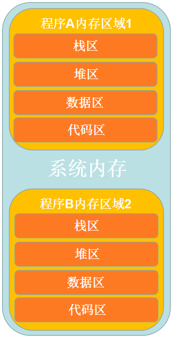 在计算机系统中,运行程序 A 将会在内存中开辟程序 A 的内存区域 1,运行程序 B 将会在内存中开辟程序 B 的内存区域 2,内存区域 1 与内存区域 2 之间逻辑分隔。