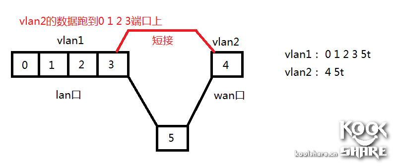 我们把0 1 2 3 和5标记到一个vlan1里面,把4和5标记到另一个vlan2里面,这样0 1 2 3和4端口,实际是vlan隔离的,但是5这个cpu是同一个,可以负责把0 1 2 3的数据转发到4上面,又能把4上面的数据转发到0 1 2 3上面。为了能保证5能有多个vlan通过,所以给5打个t的标记,表示它是trunk。