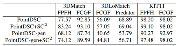 为了验证所提出的二阶兼容性度量的可扩展性,我们将它与当前最好的深度学习方法PointDSC结合。从表4中可以看出,度量可以提升深度学习方法的性能,尤其是泛化性。