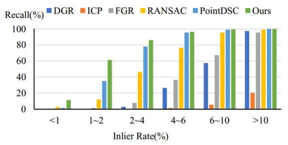 在某些极端情况下,描述子建立的匹配中会含有大量的误匹配,正确匹配的比例可能低于1%。为了验证在不同内点率下算法的稳定性,我们根据内点率将数据集划分为六组,并统计了不同方法在这些内点率下的配准召回率,如图5所示。从图中可以看出,我们的方法对于低内点率更稳定,尤其是在内点率低于2%时。