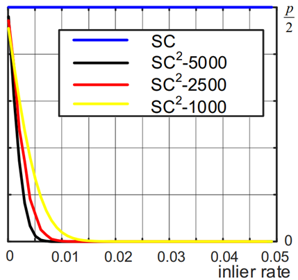 我们从概率的角度证明了所提出的二阶兼容性可以减少错误采样的概率。具体来说,我们定义了一个模糊事件,即外点和内点的相似性比内点之间相似性高这一事件。我们分析了一阶兼容性和所提出的二阶兼容性的模糊事件概率,可以证明所提出的度量更稳定