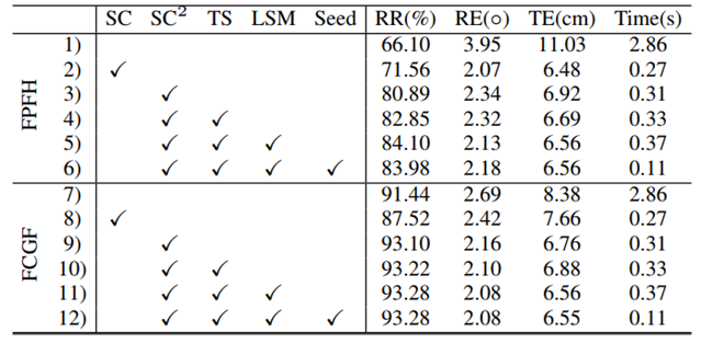 所提出所有模块的消融实验如表5所示。我们以传统的RANSAC为baseline,逐步添加所提出的模块。其中:SC为一阶兼容性引导的采样;为二阶兼容性引导的采样;TS为二阶段采样方式;LSM为基于局部谱匹配的姿态估计方式;Seed为引入种子点提高算法效率。