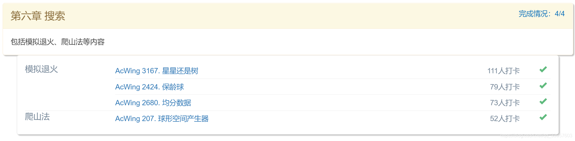模拟退火 AcWing 3167. 星星还是树110人打卡 AcWing 2424. 保龄球78人打卡 AcWing 2680. 均分数据72人打卡 ...