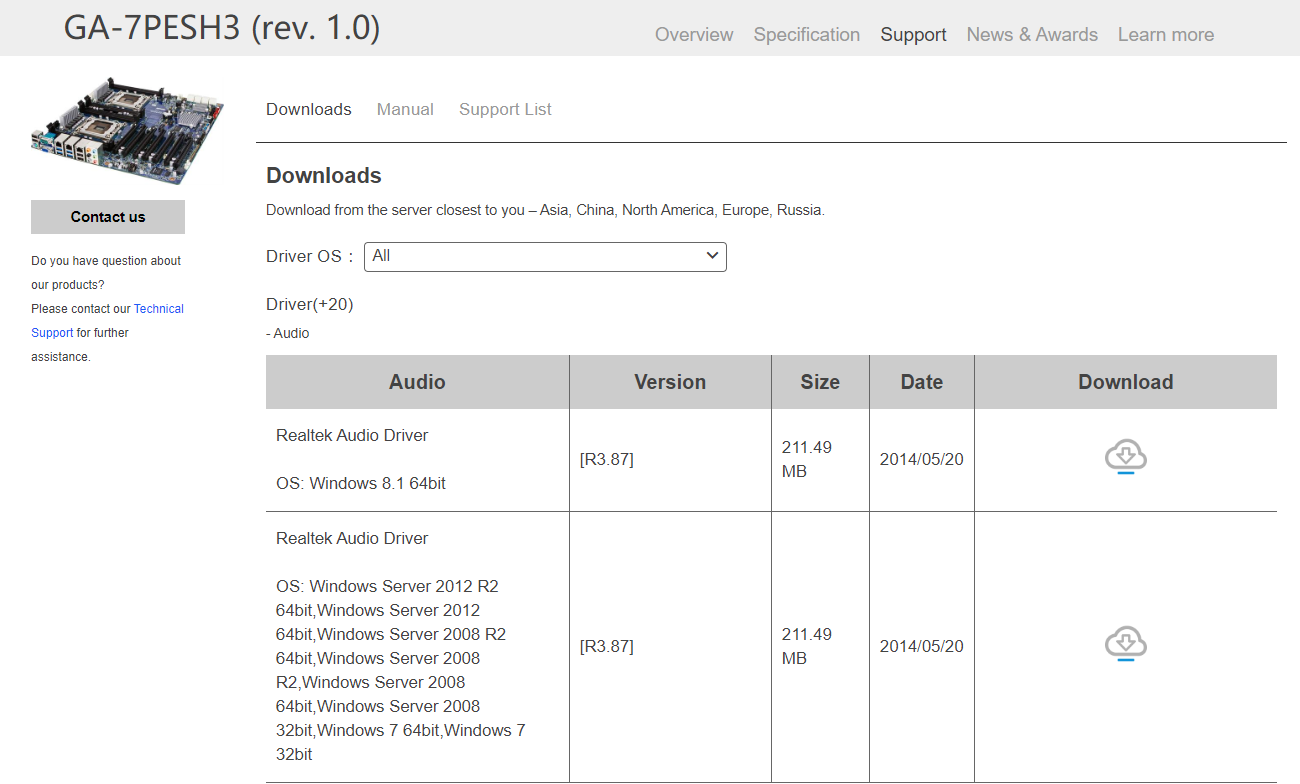 服务器主板驱动比较难找,这里给出官网地址 http://b2b.gigabyte.com/products/product-page.aspx?pid=4468#dl