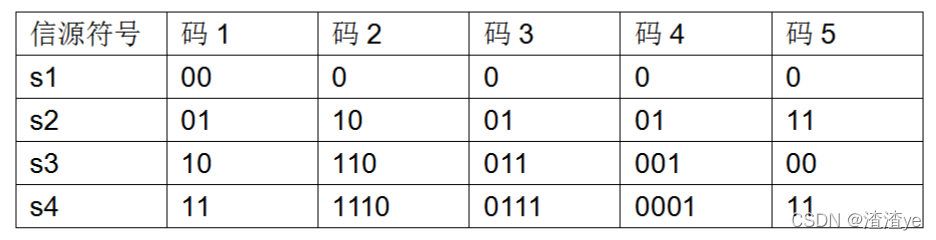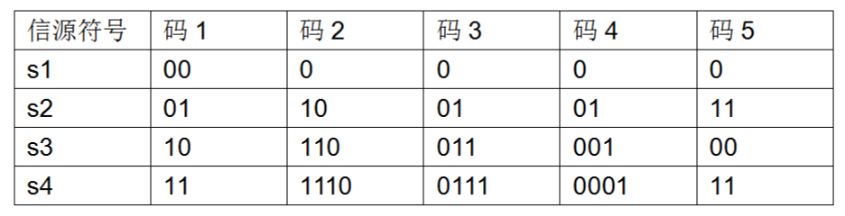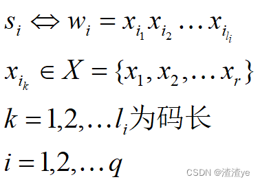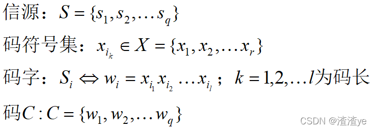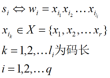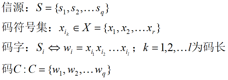 设有信源集合S={s1,s2,…sq}经信源编码后,得到代码组C{w1,w2,…wq},wi与si(i=1,2,…q)是一一对应的。