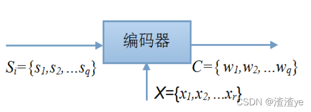 编码器的作用:是将信源符号集S中的符号si,i=1,2,…q(或者长为N的信源符号序列)变换成由基本符号xj(j=1,2,…r)组成的长为li的一一对应的输出符号序列。