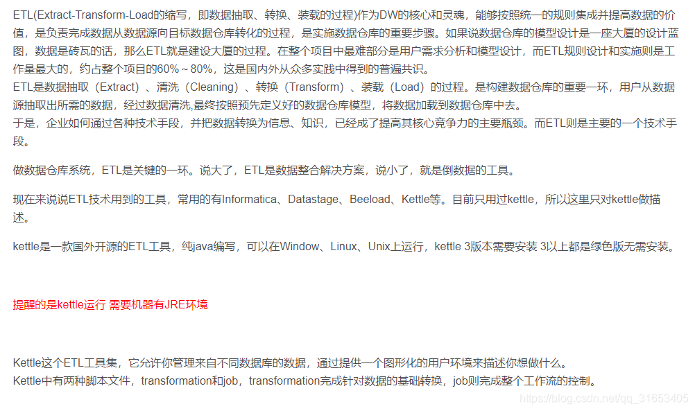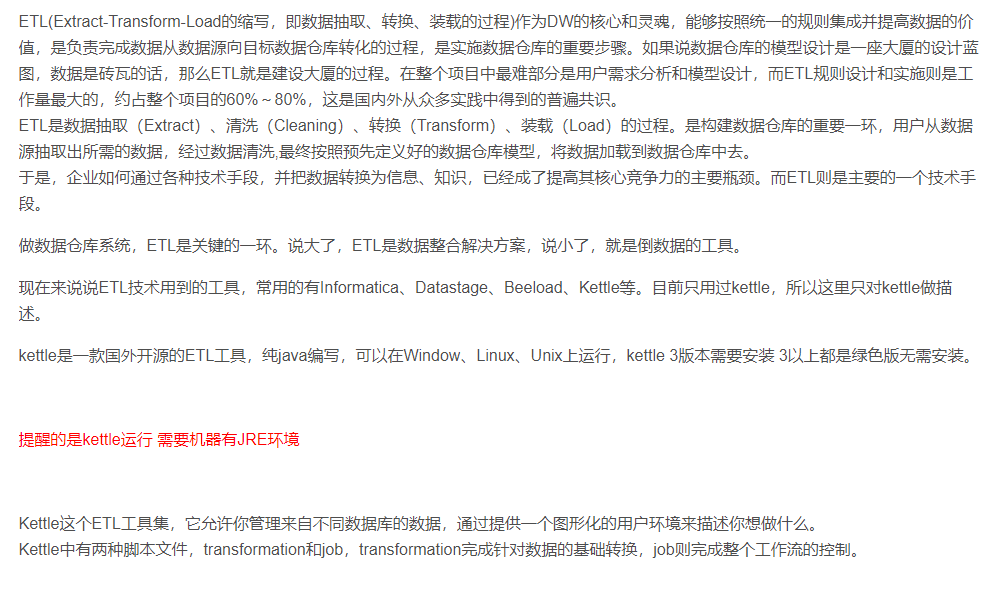 kettle 是纯 java 开发,开源的 ETL工具,用于数据库间的数据迁移,开源的ETL工具,ETL是Extract-Transform-Load的缩写,即数据抽取、转换、装载的过程.